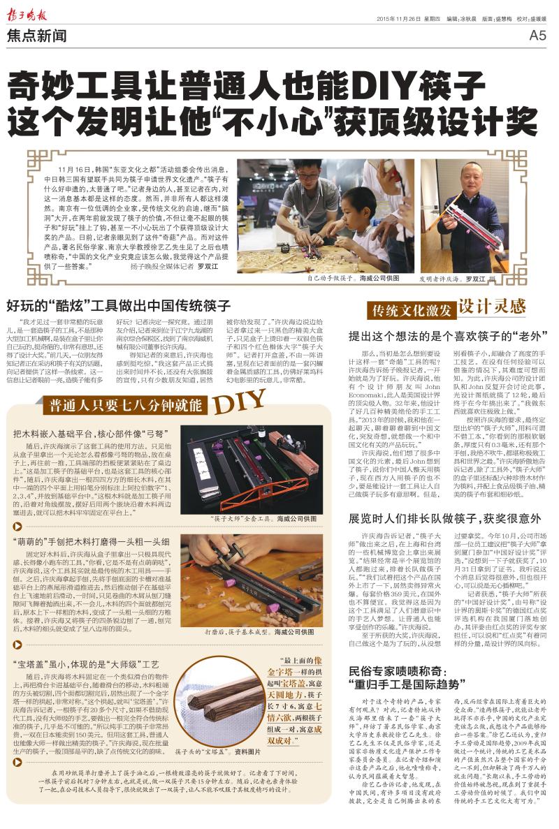 我院89届校友,南京海威机械有限公司董事长许庆海先生领衔团队研制了一套可供手工制作工艺筷子的机械——“筷子大师”,该产品于今年10月份获得了“中国好设计奖”。校友许庆海先生与其领衔研制的“筷子大师”一同荣登了2015年11月26日的扬子晚报。