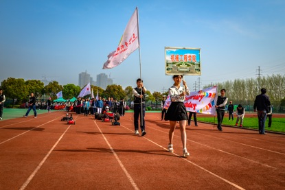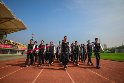 9点整伴随着《运动员进行曲》的音乐响起,各学院入场式方队便依次进入操场。每个院系的运动员代表们都昂首挺胸,迈着矫健的步伐,在艳阳高照的赛道上阔步向前。