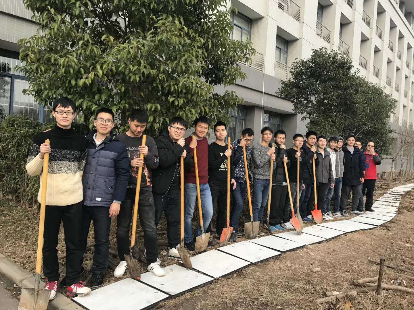 2018年1月17日下午,雨过天晴之后,学院部分研究生跟张书记一起将篱笆路改为“石板路”。特别要说明的是,我院此次重修小路是将废弃的机房地板废物利用,为了保证师生的使用安全,同学们还在前期测试了地板的防滑性和安全性。同学们分工明确,有的拿着锄头拆除原本铺在地面的木棍,有的三两结伴将“石板”按一定间距铺好。