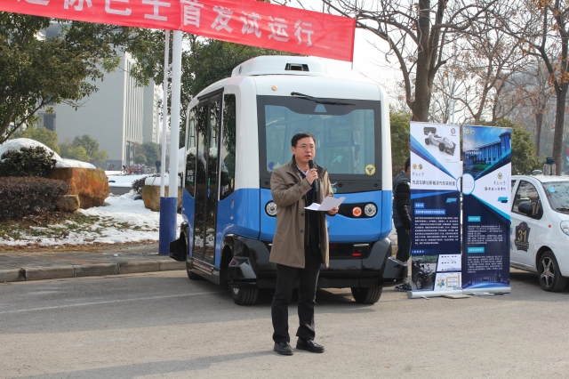 2018年2月2日上午,东南大学联合南京扬子国资投资集团有限责任公司在东南大学九龙湖校区举行合作运营的国内首辆智能网联无人迷你巴士的首发试运行,东南大学副校长吴刚教授,扬子国投集团董事长蔡龙,ylzzcom永利总站线路检测党委书记张志胜,学校相关部门负责人,以及巴士运营团队全体成员参加了首发试运行活动。发布会由ylzzcom永利总站线路检测副院长殷国栋教授主持。