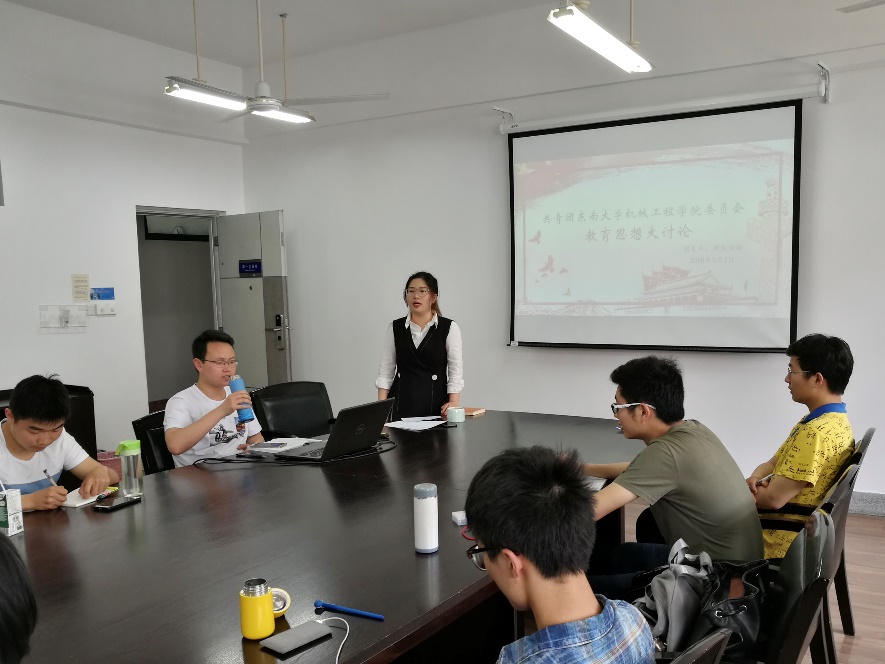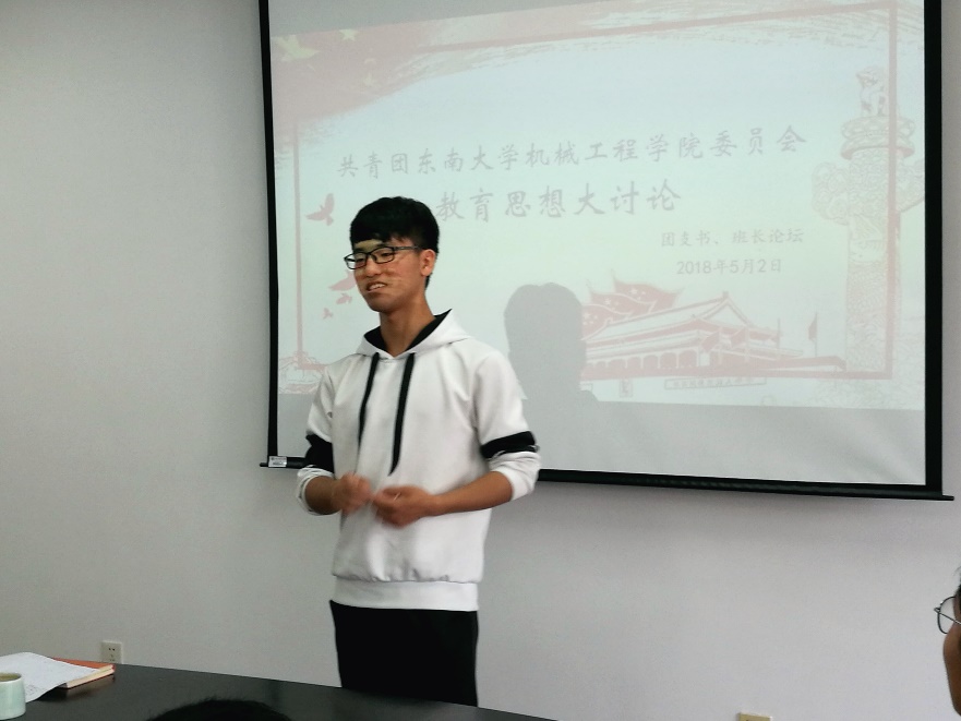 最后获得国旗团支部提名奖的团支书戴松乔分享了所在团支部组织建设经验及获得国旗团支部提名奖幕后的故事。经过此次讨论,在座的学生干部对在东大双一流建设的大背景下如何带领所在基层组织开展工作认真思考,并有了新的体悟。相信在新时代的背景下,我院的基层组织学生干部可以配合学校积极开展工作,为推进学校双一流建设的工作提供创意和色彩。