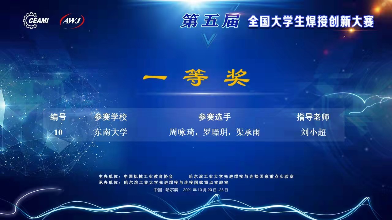2021年10月20日-23日第五届全国大学生焊接创新大赛决赛在哈尔滨工业大学举行,本次大赛共有来自哈尔滨工业大学、清华大学、东南大学、天津大学、西北工业大学、吉林大学、中南大学等62所高校的220件作品参加决赛,我校首次组织队伍参赛,并最终获得一等奖1项、二等奖1项、三等奖2项的优异成绩。