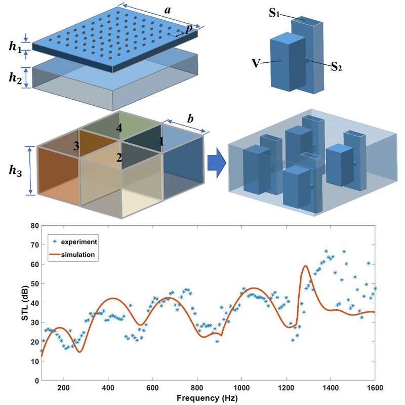 近日,ylzzcom永利总站线路检测张辉教授团队和法国国家科学院Badreddine Assouar教授团队合作提出一种超薄的基于声超表面的宽带低频消声器。该工作首次提出利用微穿孔板耦合多种参数的复合波导,通过耦合共振实现低频超宽带通风型隔声。在100-1600Hz四个倍频程范围内实现了高于20dB隔声量的隔声。而整个3-D打印的超表面样品的厚度只有6.2cm,对应于最大工作波长的1/55。结构的设计可通过电力声类比的等效电路模型进行理论分析,通过对比不同的结构参数,如穿孔板孔径、中间层的厚度,最终得到优化的隔声曲线。该设计在隔声效率、带宽、通风性和样品厚度四方面具有良好的表现。该工作极大地促进了在满足通风的前提下,声超表面在低频宽带隔声的应用。该工作在工程领域和实际应用场合具有广泛的应用前景。相关研究工作发表在《Physical Review Applied》上。