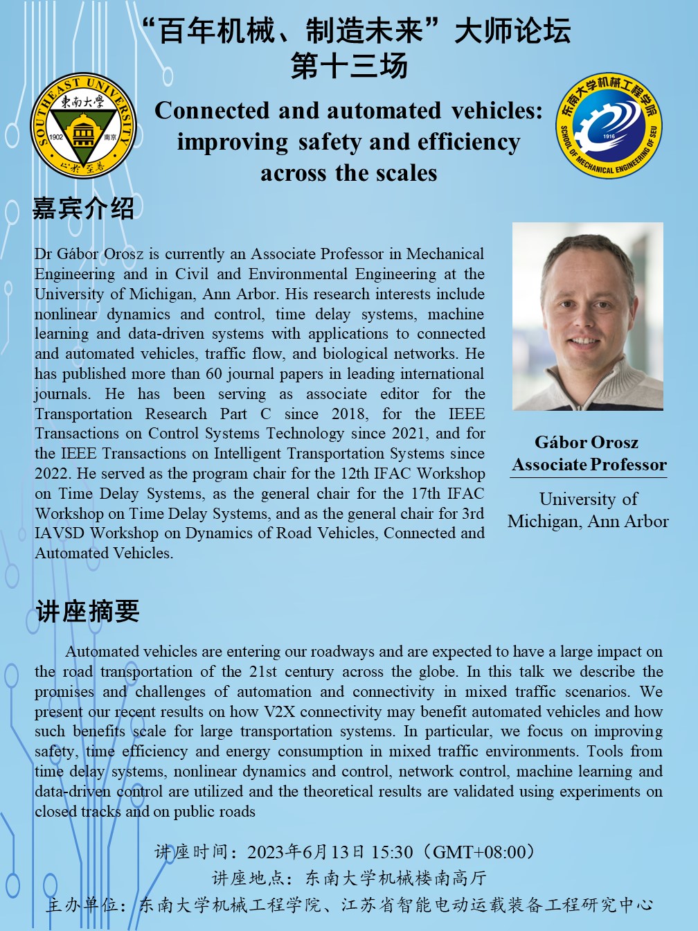 专家简介:Dr Gabor Orosz received the MSc degree in Engineering Physics from the Budapest University of Technology, Hungary, in 2002 and the PhD degree in Engineering Mathematics from University of Bristol, UK, in 2006. He held postdoctoral positions at the University of Exeter, UK, and at the University of California, Santa Barbara. In 2010, he joined the University of Michigan, Ann Arbor where he is currently an Associate Professor in Mechanical Engineering and in Civil and Environmental Engineering.