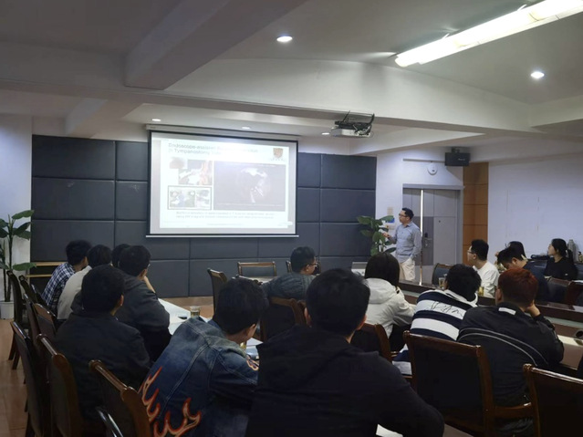 在讲座中,张立教授首先阐述了人体腔道内的医疗机器人尺度规模的发展,并论述了有缆微机器人和无缆微机器人在腔道内导航的优缺点,最终提出了通过外部磁场来控制腔内磁性微型机器人的策略。而后,张立教授就磁性微机器人的形状、控制理论、生物相容性、追踪成像等各方面展开了详细的介绍。对于磁性微机器人的形状,张立教授着眼于自然界生物的固有特征,确定了“螺旋型”的外观;对于控制理论,张立教授从梯度磁场驱动和磁矩驱动两方面来为师生们解释运动机理;而对于生物相容性问题,张立教授介绍了其课题组的成果,使用自然界中的生物“螺旋藻(spirulina)”作为机器人主体,该类生物能够在人体内自然降解,并不会对人体产生有害影响。对于追踪成像方面,张立教授介绍了同我院王乾乾老师的合作研究,通过超声成像、激光散斑成像等前沿技术显示磁性微机器人在人体腔道的位置。