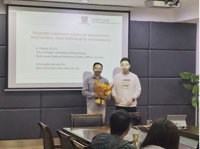 整场讲座中,张立教授的讲解条理清晰,逻辑严密,语言生动,让在场的师生深受启发。现场学术氛围十分浓厚,张立教授用通俗易懂的比喻解读较难的学术词汇,并结合多个视频,更直观地为在场师生讲解磁性微机器人的腔内治疗原理。张立教授的讲座为我们揭示了磁性微型机器人在精准医疗领域的巨大潜力。随着技术的不断进步和创新,我们有理由相信,磁性微型机器人将为未来的医疗治疗带来革命性的变革,为患者带来更加安全、高效、精准的治疗体验。