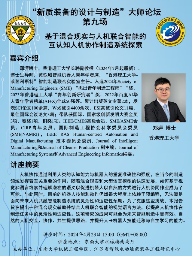 郑湃博士,香港理工大学长聘副教授(2024年7月起履新)、博士生导师,黄铁城智能机器人青年学者席,“香港理工大学-莱茵科斯特”智能制造联合实验室主任。入选2024年Society of Manufacturing Engineers (SME) “杰出青年制造工程师”“奖,2023年香港理工大学“青年创新研究者”奖,2022年百度AI华人青年学者榜单(AI+X)全球50强等。累计出版英文专著2本,发表SCI论文100余篇,WoS被引4400余次,ESI高被引论文11篇,最佳国际会议论文3篇;带队获国际、国家级创新发明大赛金奖3项,银奖1项,铜奖1项。IEEE/CMES高级会员,SME/ASME会员,CIRP青年会员,国际制造工程协会科学委员会委员(SME|NAMRI),IEEE RAS Human-centred Automation and Digital Manufacturing 技术委员会委员, Journal of Intelligent Manufacturing和Journal of Cleaner Production 副主编,Journal of Manufacturing Systems和Advanced Engineering Informatics编委。