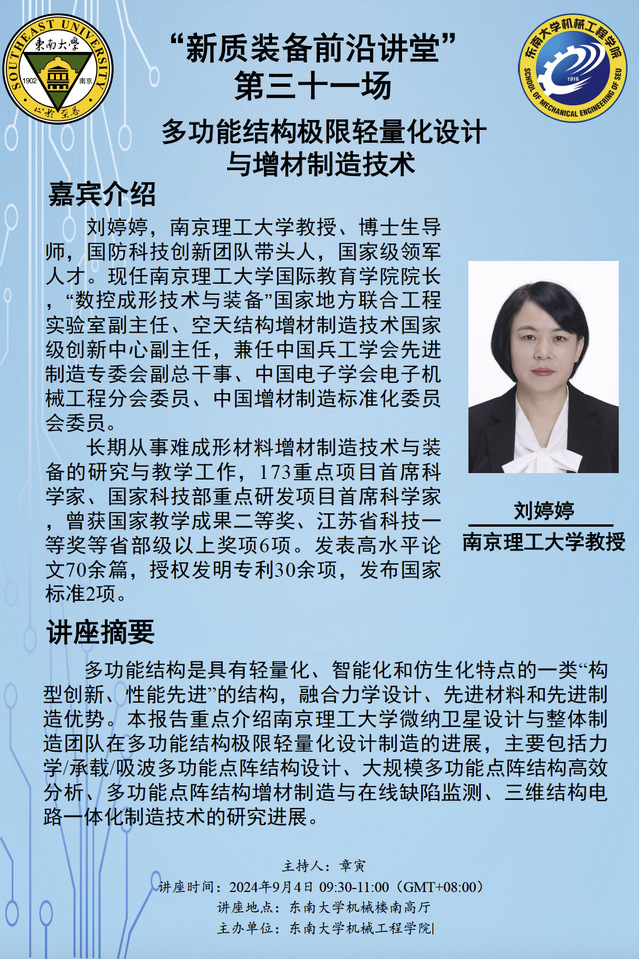 刘婷婷,南京理工大学教授、博士生导师,国防科技创新团队带头人,国家级领军人才。现任南京理工大学国际教育学院院长,“数控成形技术与装备”国家地方联合工程实验室副主任、空天结构增材制造技术国家级创新中心副主任,兼任中国兵工学会先进制造专委会副总干事、中国电子学会电子机械工程分会委员、中国增材制造标准化委员会委员。长期从事难成形材料增材制造技术与装备的研究与教学工作,173重点项目首席科学家、国家科技部重点研发项目首席科学家,曾获国家教学成果二等奖、江苏省科技一等奖等省部级以上奖项6项。发表高水平论文70余篇,授权发明专利30余项,发布国家标准2项。