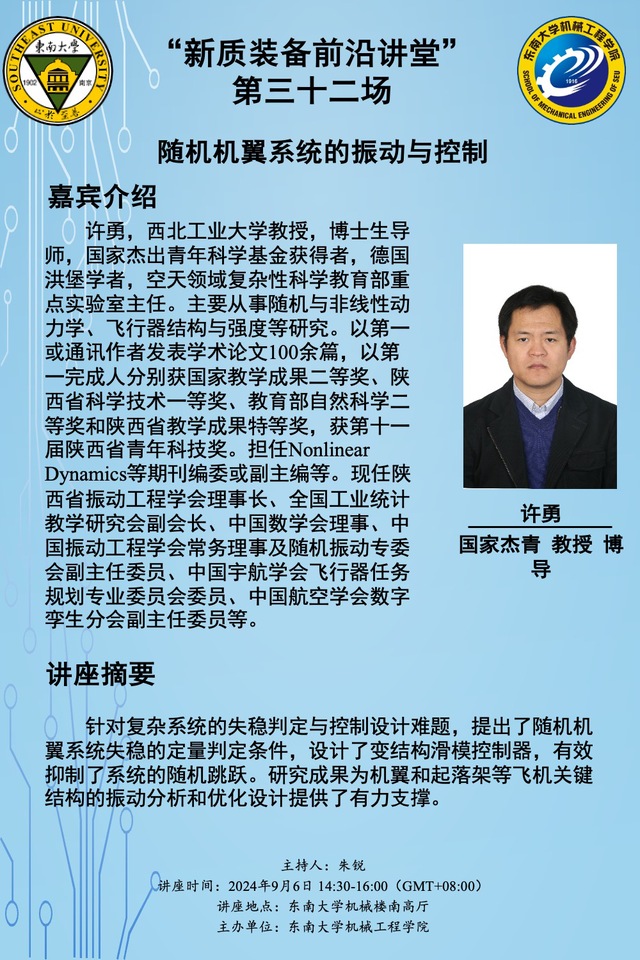 许勇,西北工业大学教授,博士生导师,国家杰出青年科学基金获得者,德国洪堡学者,空天领域复杂性科学教育部重点实验室主任。主要从事随机与非线性动力学、飞行器结构与强度等研究。以第一或通讯作者发表学术论文100余篇,以第一完成人分别获国家教学成果二等奖、陕西省科学技术一等奖、教育部自然科学二等奖和陕西省教学成果特等奖,获第十一届陕西省青年科技奖。担任Nonlinear Dynamics等期刊编委或副主编等。现任陕西省振动工程学会理事长、全国工业统计教学研究会副会长、中国数学会理事、中国振动工程学会常务理事及随机振动专委会副主任委员、中国宇航学会飞行器任务规划专业委员会委员、中国航空学会数字孪生分会副主任委员等。