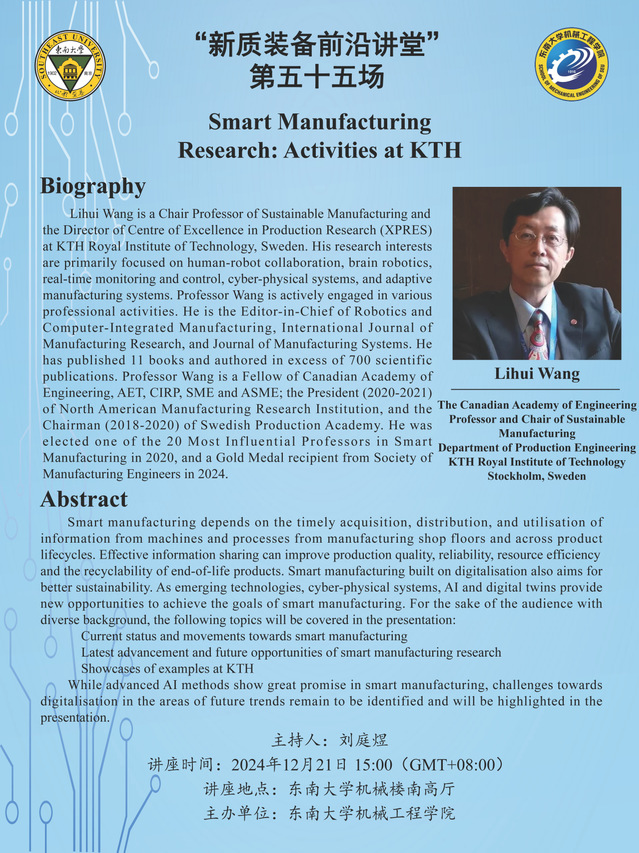 “新质装备前沿讲堂”第五十五场:Prof. Liuhui Wang——Smart Manufacturing Research: Activities at KTH
