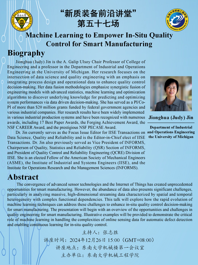 “新质装备前沿讲堂”第五十七场:Prof.Jionghua (Judy) Jin——Machine Learning to Empower In-Situ Quality Control for Smart Manufacturing