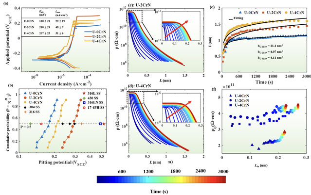 图2 氮间隙固溶CoCrFeMnNi高熵合金沉积层微观组织极化行为和钝化行为。(a) 动电位极化曲线, (b)点蚀电位累积概率分布图, (c, d)基体/膜界面的电阻率(ρ0), (e) 等效钝化膜厚度(L), (f)ρ0和钝化膜内层厚度(Lin)的关系。
