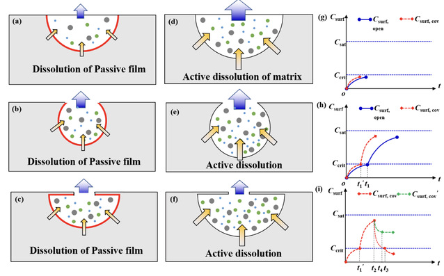 图3 气孔诱导氮间隙固溶CoCrFeMnNi高熵合金的点蚀形成机制。(a, b, c)钝化膜溶解阶段三种类型气孔内部阳离子的聚集, (d, e, f)气孔的活性溶解, (g, h, i)气孔内阳离子浓度的演变。