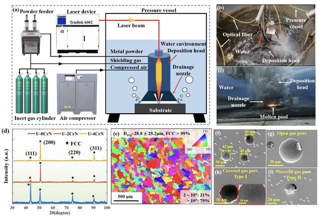 图1实验方法和微观组织。(a) 水下激光沉积系统示意图,(b, c) 水下激光沉积实验过程。(d) XRD图谱, (e) 沉积层顶部的IPF图,(f-i)开放式气孔和覆盖式气孔形貌。