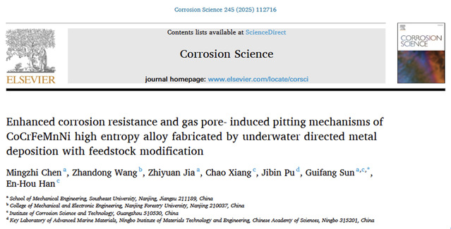 近日,我院机械制造系孙桂芳教授与广东腐蚀科学与技术创新研究院、华南理工大学韩恩厚院士合作,采用水下激光沉积技术一步成形制备氮间隙固溶CoCrFeMnNi高熵合金。系统研究氮间隙固溶CoCrFeMnNi高熵合金沉积层的微观组织、自钝化行为、极化特征和以及气孔诱导点蚀机制。相关研究成果以“Enhanced corrosion resistance and gas pore-induced pitting mechanisms of CoCrFeMnNi high entropy alloy fabricated by underwater directed metal deposition with feedstock modification”为题发表在腐蚀科学领域顶级期刊《Corrosion Science》。