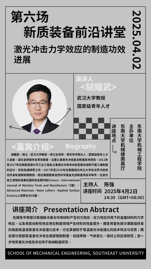 2025年我院“新质装备前沿讲堂”第六场:胡耀武教授——激光冲击力学效应的制造功效进展