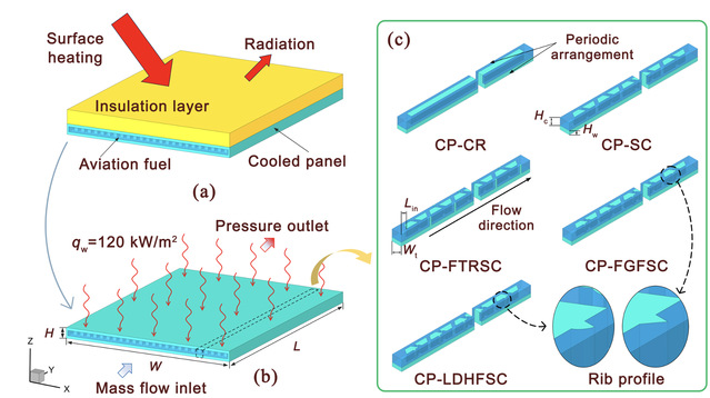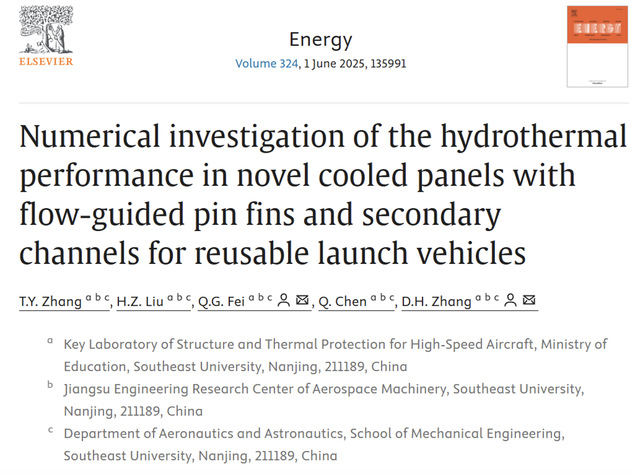 近日,我院航空航天系费庆国教授团队在热力学领域TOP期刊《Energy》(中科院一区TOP期刊,IF=9.0)上发表题为“Numerical investigation of the hydrothermal performance in novel cooled panels with flow-guided pin fins and secondary channels for reusable launch vehicles”的研究成果,提出了一种用于可重复使用飞行器热防护的带有导流针翅和二次流道的微通道换热冷板。