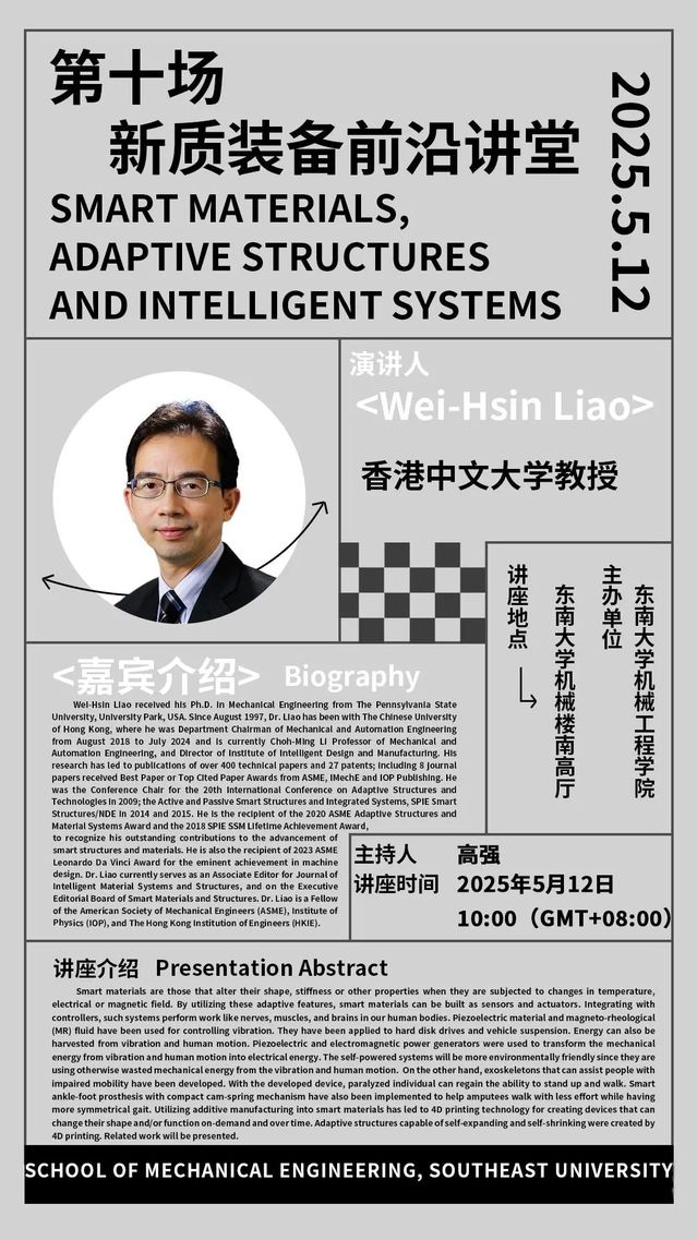 2025年我院“新质装备前沿讲堂”第十场:Prof. Wei-Hsin——Smart Materials, Adaptive Structures and Intelligent Systems