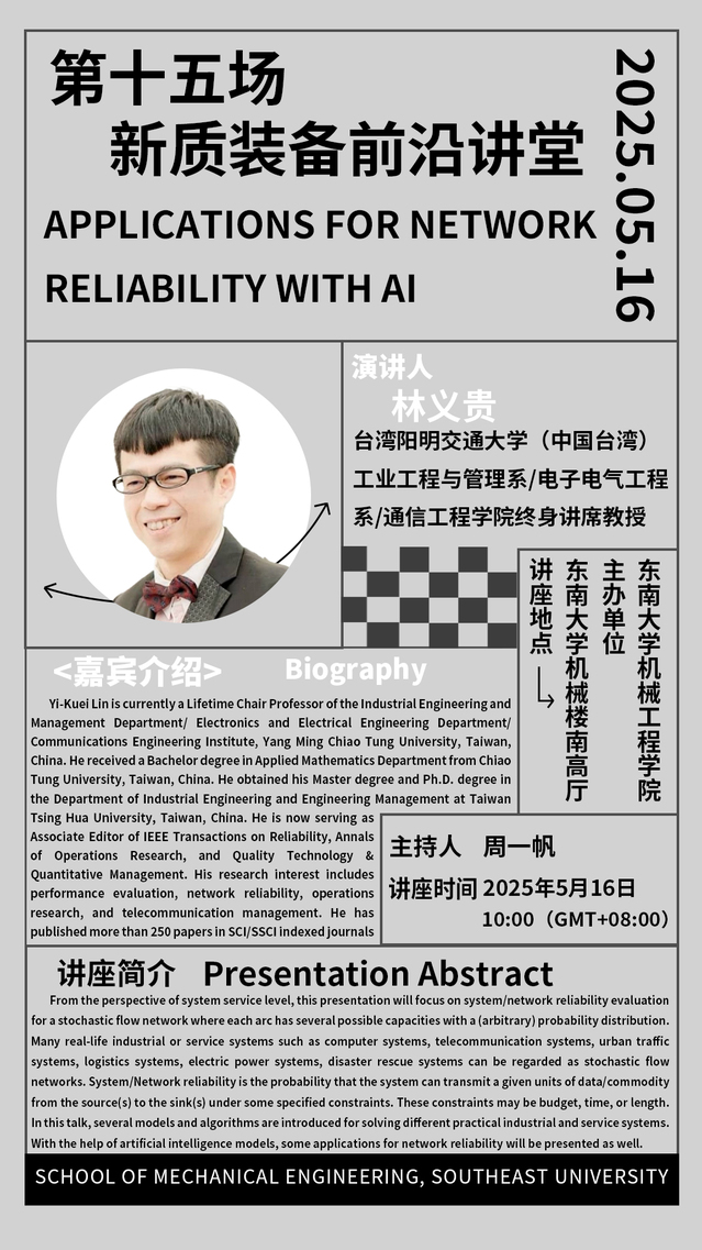 Yi-Kuei Lin is currently a Lifetime Chair Professor of the Industrial Engineering and Management Department/ Electronics and Electrical Engineering Department/Communications Engineering Institute, Yang Ming Chiao Tung University, Taiwan, China. He received a Bachelor degree in Applied Mathematics Department from Chiao Tung University, Taiwan, China. He obtained his Master degree and Ph.D. degree in the Department of Industrial Engineering and Engineering Management at Taiwan Tsing Hua University, Taiwan, China. He is now serving as Associate Editor of IEEE Transactions on Reliability, Annals of Operations Research, and Quality Technology & Quantitative Management. His research interest includes performance evaluation, network reliability, operations research, and telecommunication management. He has published more than 250 papers in SCI/SSCI indexed journals.