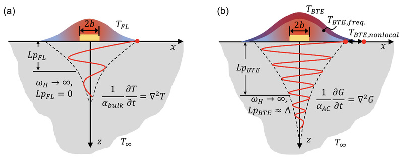 在微电子器件的高度集成化与超高运算速率的今天,芯片线宽已经降至纳米级,主频达GHz量级。当系统的时空特征尺度与半导体材料内热载流子——声子的平均自由程(弛豫时间)相当时,声子输运由扩散向弹道转变,导致经典的傅里叶定律失效。然而,目前绝大多数经典的微纳尺度热测试方法仍然将实验数据拟合于传统的热扩散方程,导致实验方法与所测试的物理现象的不自洽。
