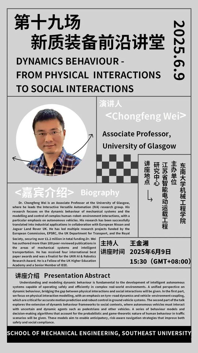 2025年我院“新质装备前沿讲堂”第十九场:Prof. Chongfeng Wei——Dynamics Behaviour - From Physical Interactions to Social Interactions
