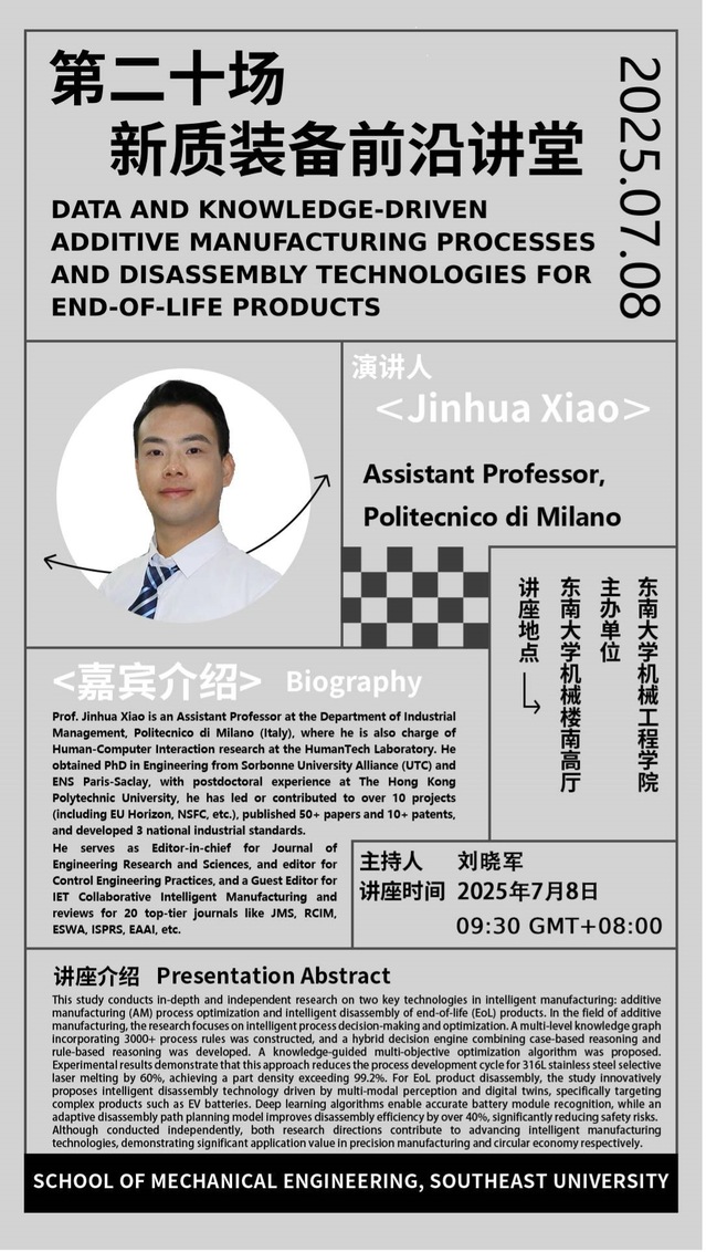 2025年我院“新质装备前沿讲堂”第二十场:Prof. Jinhua Xiao——Data and Knowledge-driven additive manufacturing processes and disassembly technologies for end-of-life products