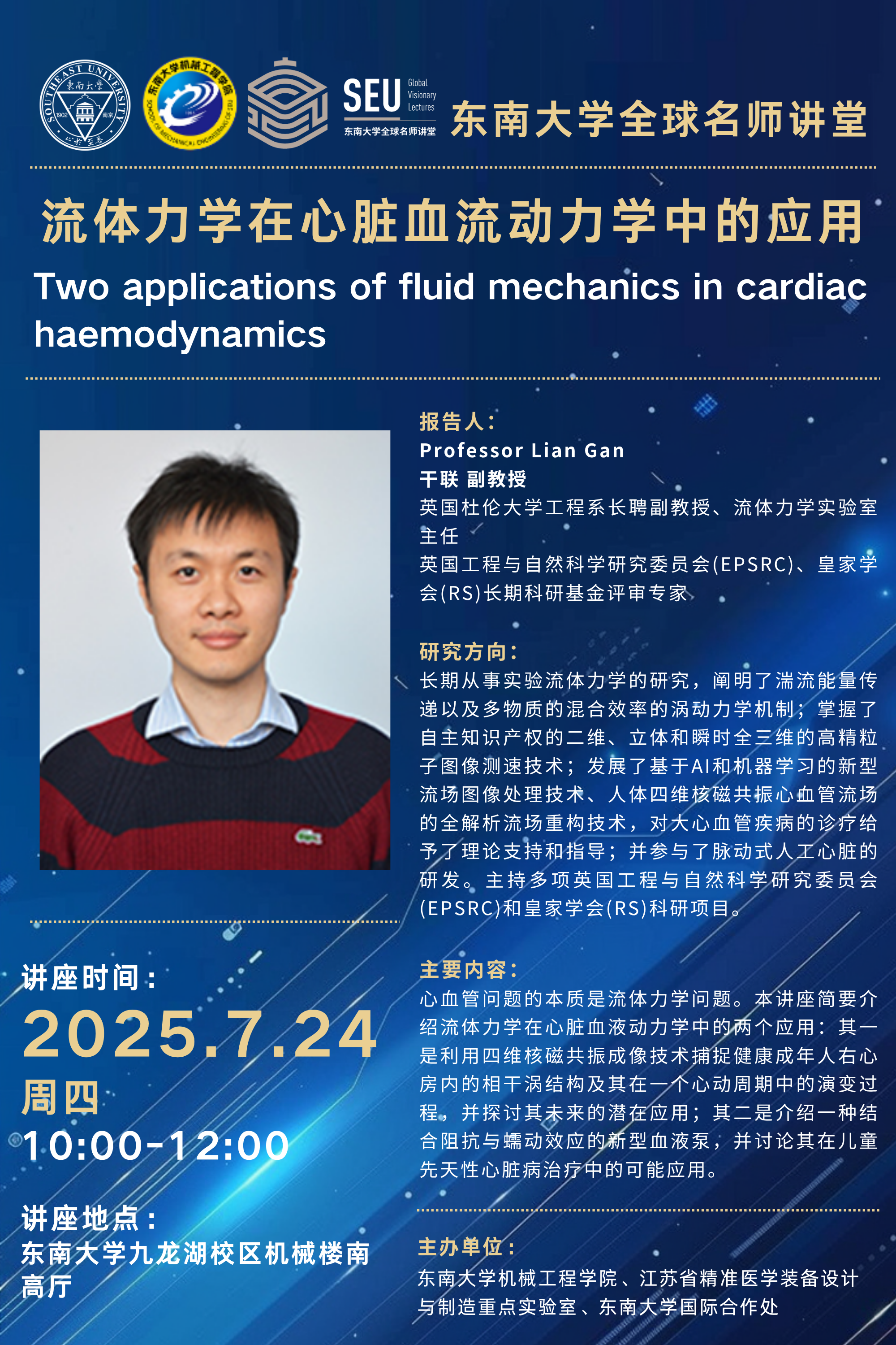2025年我院“新质装备前沿讲堂”第二十一场:Prof. Lian Gan——流体力学在心脏血流动力学中的应用