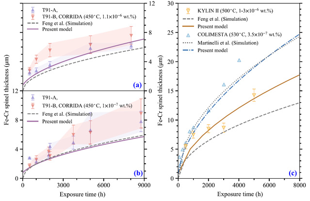 第四代铅快冷反应堆中,结构材料在高温液态铅铋共晶(LBE)环境下的氧化与流动腐蚀问题,直接关系到反应堆的长期安全运行T91钢因其优异的力学性能和抗辐照能力,成为铅冷快堆关键结构部件的重要候选材料。然而,LBE流动条件下材料的形成的双氧化层及外氧化层的溶解/剥蚀现象,会显著改变材料的腐蚀动力学过程。传统实验方法周期长、成本高,而现有氧化-腐蚀耦合模型在长期预测精度方面存在不足。因此,建立能够准确模拟氧化层生长与流动加速腐蚀的预测模型,对材料服役寿命评估和反应堆运行参数优化具有重要工程价值。我院孙东科教授研究团队与华中科技大学柴振华教授研究团队创新性地提出了基于格子Boltzmann方法的相场模型(LB-PF),通过耦合反应-扩散方程,精确描述了T91钢在流动LBE中的氧化动力学和腐蚀行为。模型成功复现了氧化层的抛物线生长规律,并通过实验数据验证了其可靠性。模拟五年期服役过程表明:温度是氧化层生长的关键控制因素,而溶解氧浓度在~1×10⁻⁶ wt.%时,可在氧化膜保护性和流动稳定性之间达到最佳平衡。该研究为铅冷快堆结构材料的长期腐蚀评估提供了高效、可靠的数值模拟工具,其预测结果可为实验设计和工程应用提供理论指导及软件工具