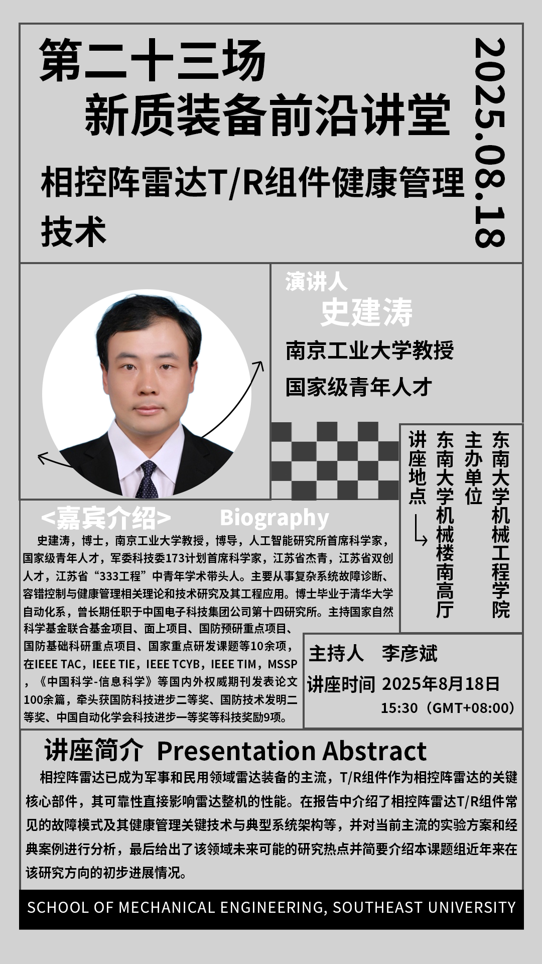 2025年我院“新质装备前沿讲堂”第二十三场:史建涛教授——相控阵雷达T/R组件健康管理技术