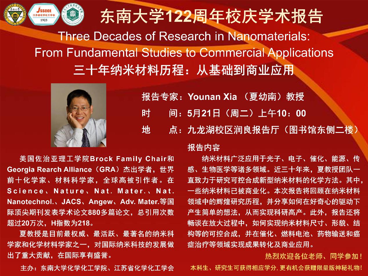 纳米材料广泛应用于光子、电子、催化、能源、传感、生物医学等诸多领域。近三十年来,夏教授团队一直致力于研究可控合成新型纳米材料的化学方法。其中,一些纳米材料已被商业化。本次报告将回顾在纳米材料领域中的辉煌研究历程,并分享如何在好奇心的驱动下产生简单的想法,从而实现科研高产。此外,报告还将畅谈在放大过程中,如何实现纳米材料尺寸、形貌、结构等的可控合成,并在催化、燃料电池、药物输送和癌症治疗等领域实现成果转化及商业应用。