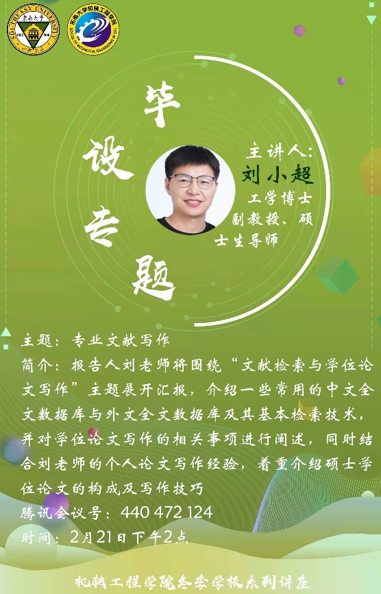 221日下午,毕业设计专题指导讲座第二场开讲,由ylzzcom永利总站线路检测副教授、硕士生导师刘小超老师带来内容为文献检索和学位论文习作的分享。刘老师首先详细地介绍了中英文全文数据库检索,包括数据库的定义、类型以及检索的逻辑等,很大程度上帮助同学们缩小了检索范围,提高检索的效率。此外,刘老师以自己的本科和硕士毕设论文为例,结合自己的亲身体会,按照论文框架结构,为同学们详细介绍了学士学位论文写作的规范和写作技巧。讲座的最后,刘老师期望同学们重视本科毕业设计,认真做好每一项工作,为以后的科学研究打下良好的基础。