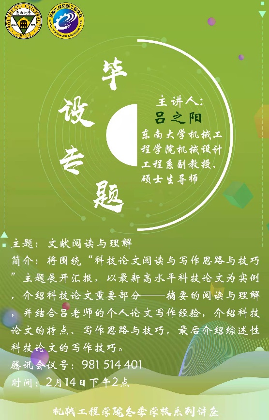 214日下午,毕业设计专题首场线上首场讲座开讲,由ylzzcom永利总站线路检测副教授、硕士生导师吕之阳老师围绕“科技论文阅读与写作思路与技巧”主题展开讲解。吕老师以最新高水平科技论文为实例,介绍科技论文重要部分——摘要的阅读理解,并结合吕老师的个人协作经验,介绍科技论文的特点、写作思路与技巧,并对综述性科技论文的写作技巧进行了详细阐述。在讲座的最后,吕老师针对同学们的问题发表了自己独特的见解,同学们收获颇丰。