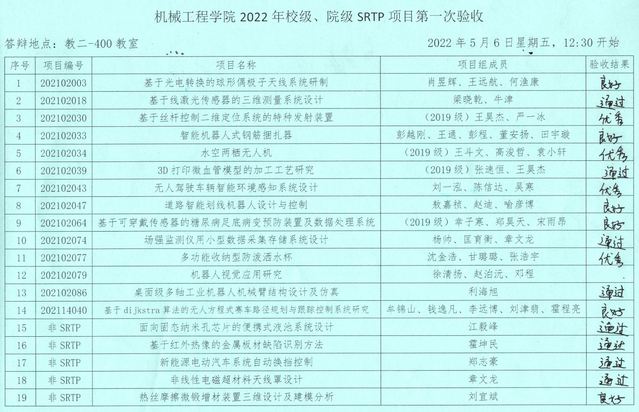 ylzzcom永利总站线路检测2022年校级、院级SRTP项目第一次验收于2022年5月6日12:30至15:00在本科教学楼进行。本次有19个项目参加现场验收,经过答辩评审老师认真评审,共有4个项目或优秀,6个项目获良好,9个项目获通过,现将验收结果公示如下。