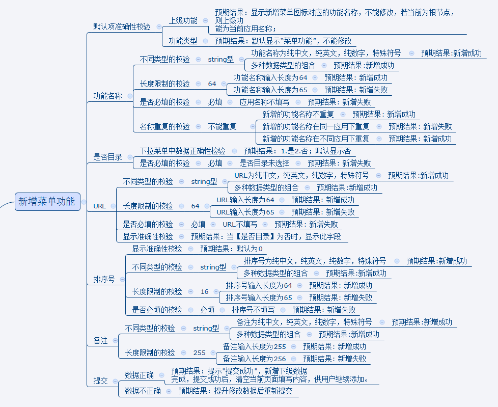 测试用例编写。利用XMind软件进行测试用例的编写,将所要测试的功能具体操作和预期结果一一列出,包括页面、列表、新增、修改、审批等web操作测试,为后续测试提供条理性准备。