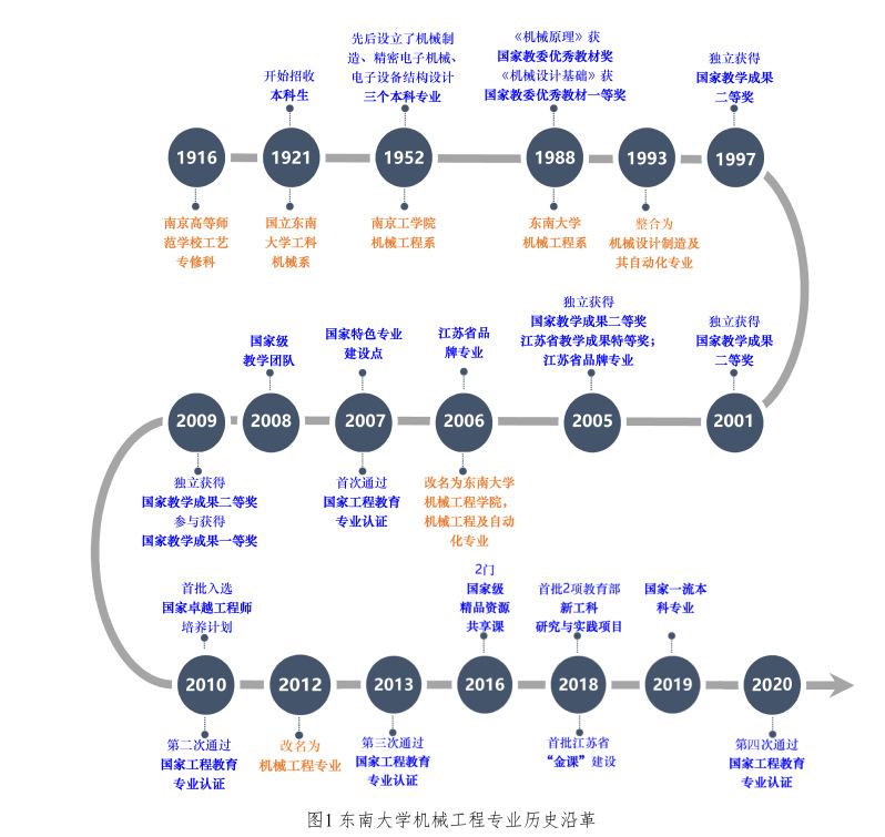 机械工程专业,起源于1916年创办的南京高等师范学校工艺专修科,是东南大学最早设置的工科类专业,1921年开始招收本科生,是国内最早建立的机械系科。1952年院系调整后,原南京工学院机械工程系先后设立了机械制造、精密电子机械、电子设备结构设计等3个本科专业。根据教育部颁布的《普通高等学校本科专业目录》,1993年上述3个本科专业整合为机械设计制造及其自动化专业,2006年改名为机械工程及自动化专业,2012年改名为机械工程专业。该专业2006年入选首批江苏省高等学校品牌专业,2007年入选国家高等学校特色专业建设点,2010年入选首批教育部卓越工程师教育培养计划试点专业,2019年入选首批国家级一流本科专业建设点。2007、2010、2013年和2020年,先后四次通过了国家工程教育专业认证。现拥有机电综合工程训练国家级实验教学示范中心,以及教育部新型光源技术与设备工程研究中心、江苏省微纳生物医疗器械设计与制造重点实验室、江苏省电磁兼容专业测试中心、江苏省空天机械装备工程研究中心、江苏省高档数控机床及成套装备创新中心江苏省智能电动运载装备工程研究中心6个省级教研实践中心。
